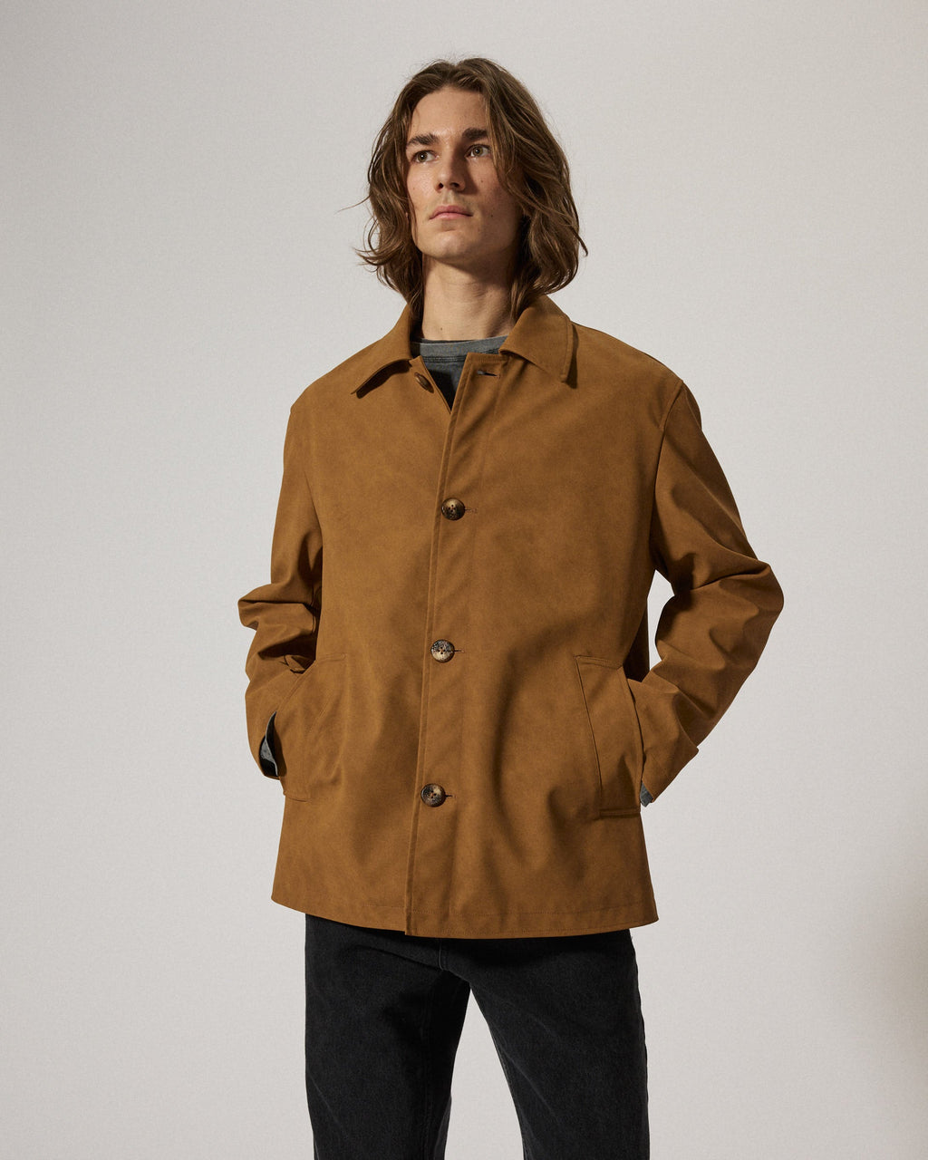 Regular fitted overshirt tailored in a modern silhouette crafted in a vegan fake leather suede made partially from recycled fibers with a slight brushed finish which creates a soft feel to the touch, certified under the Global Recycle Standard. Featured with sewn buttons at front, a regular collar, front welt pockets and an inside pocket for added function.