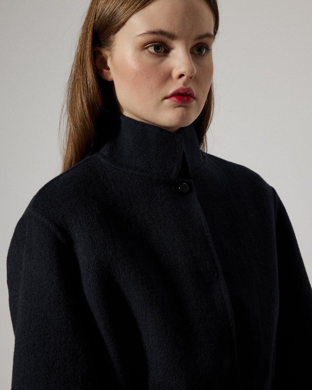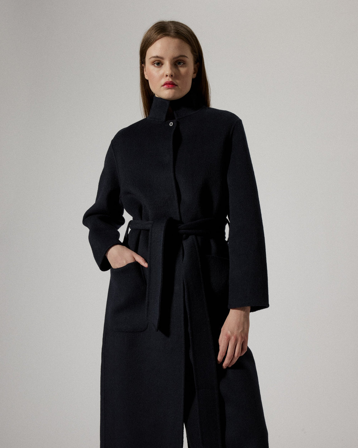 Coat Bem has a longer fit, tailored with a regular fitted shoulder, large front patch pockets and a belt at the waist for added shape. Crafted in a recycled wool blend with a slight brushed finish which creates a soft feel to the touch, certified under the Global Recycle Standard. Featured with a standing collar and concealed snap buttoning at front closure.