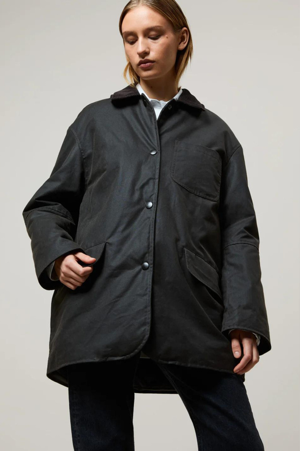 Billy Padded is an oversized waxed organic cotton jacket, manufactured in the city of Birminghamn, UK, featuring a water-resistant finish with a regular collar in corduroy. Featuring a snap-button front closure, a chest patch pocket, and two front flap pockets. Padded for added warmth. For a long lasting garment, periodically rewax the shell fabric.