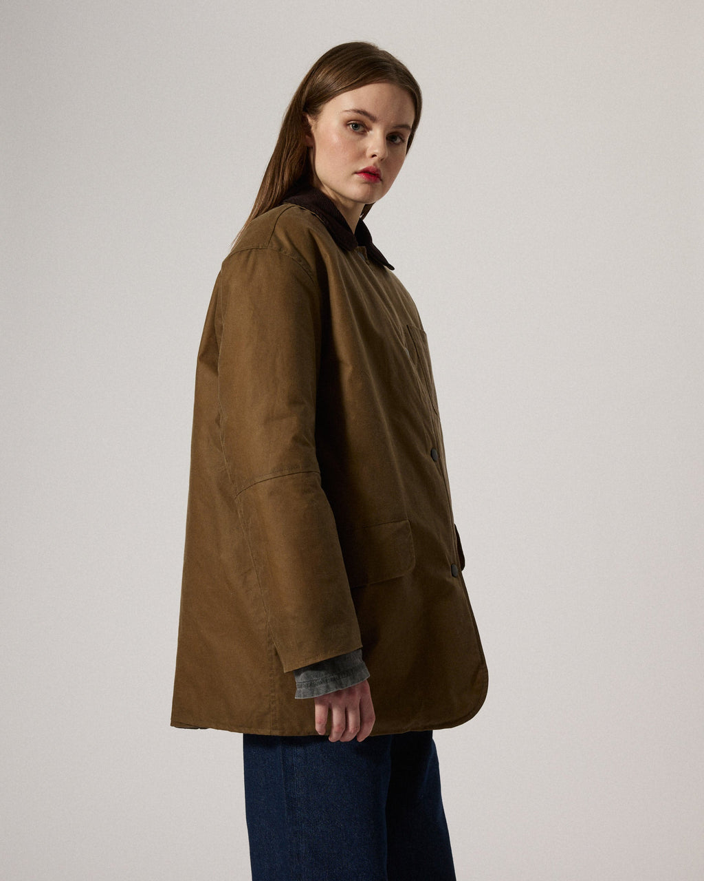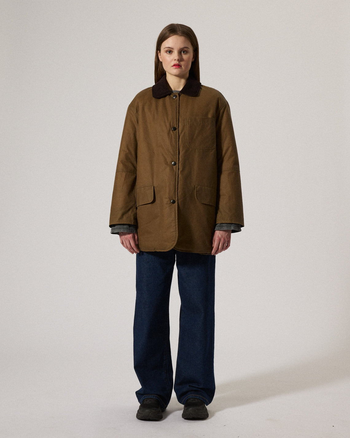 Billy Padded is an oversized waxed organic cotton jacket, manufactured in the city of Birminghamn, UK, featuring a water-resistant finish with a regular collar in corduroy. Featuring a snap-button front closure, a chest patch pocket, and two front flap pockets. Padded for added warmth. For a long lasting garment, periodically rewax the shell fabric.