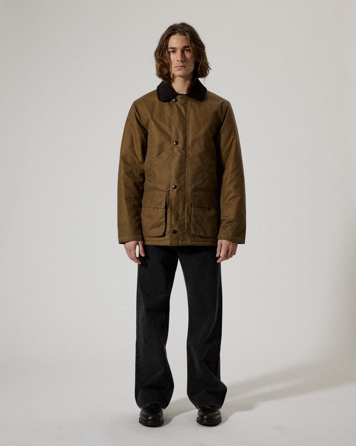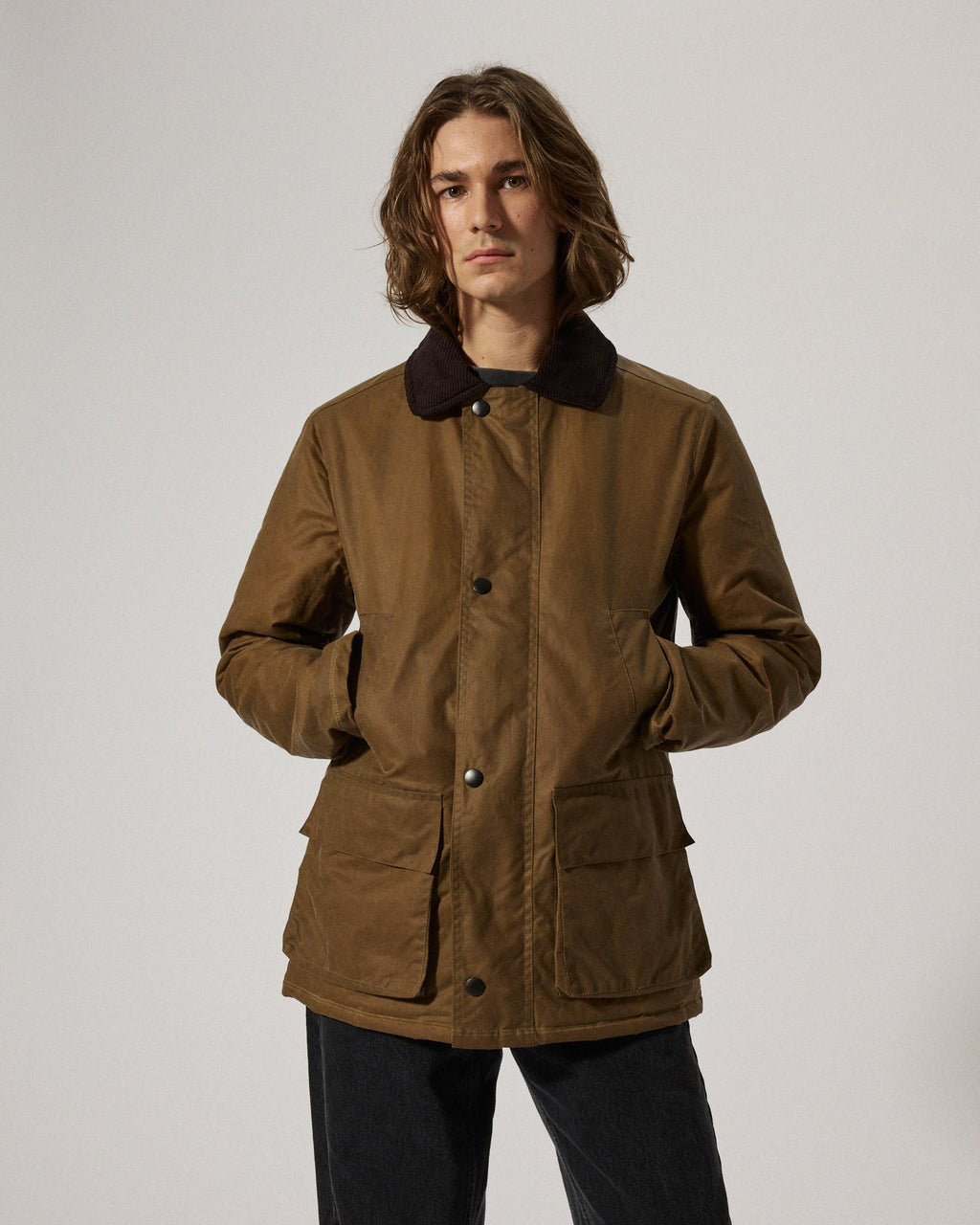 Curtis is a mid-length jacket in a regular fit made from a durable high quality organic cotton treated with a water resistant wax finish in Dundee, Scotland. Features a corduroy collar, snap button closure, two front flap pockets and two slanted welt pockets to keep your hands warm. Manufactured in the city of Birmingham, UK. For a long lasting garment, periodically rewax the shell fabric.