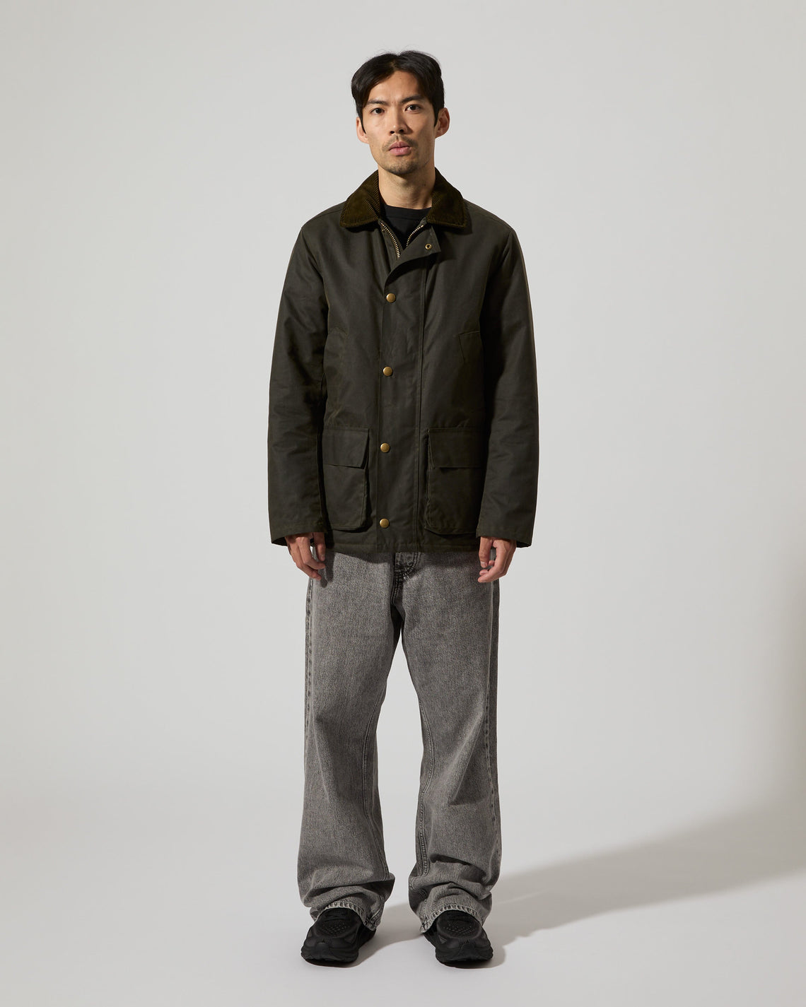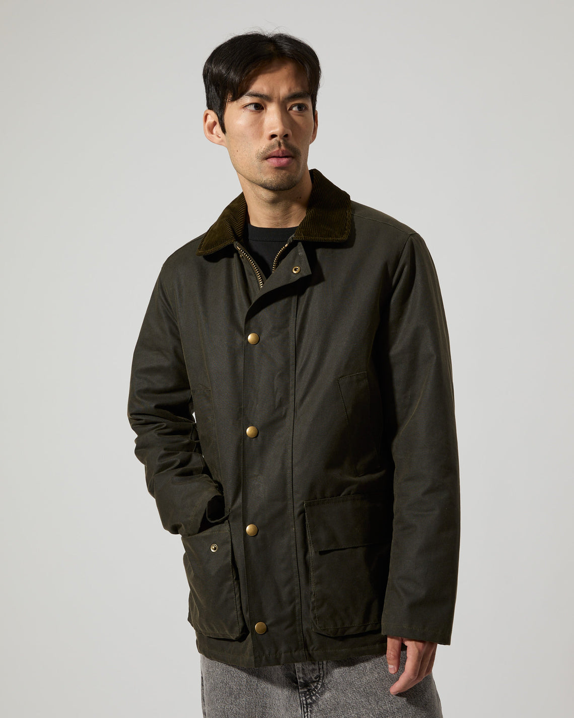 Curtis is a mid-length jacket in a regular fit made from a durable high quality organic cotton treated with a water resistant wax finish in Dundee, Scotland. Features a corduroy collar, snap button closure, two front flap pockets and two slanted welt pockets to keep your hands warm. Manufactured in the city of Birmingham, UK. For a long lasting garment, periodically rewax the shell fabric.