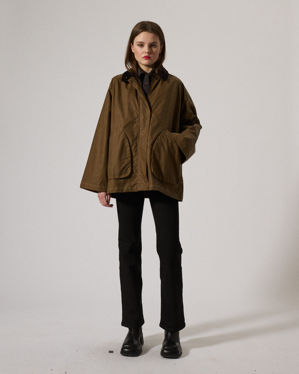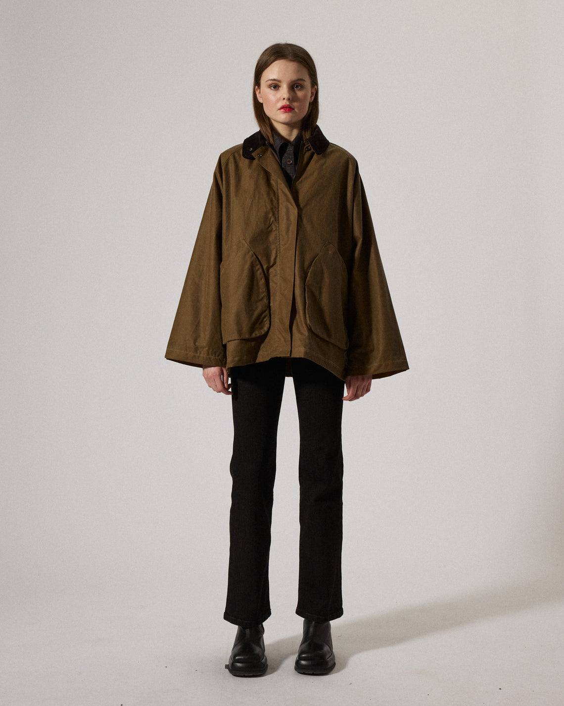 Davonna is an oversized waxed organic cotton jacket in a relaxed, A-line silhouette manufactured in the city of Birminghamn, UK. Features a regular corduroy collar, large curved front pockets, and a concealed snap-button and two way zipper front closure for a clean finish. Water-resistant and wind-repellent, with an additional snap closure in collar for added protection. For a long lasting garment, periodically rewax the shell fabric.