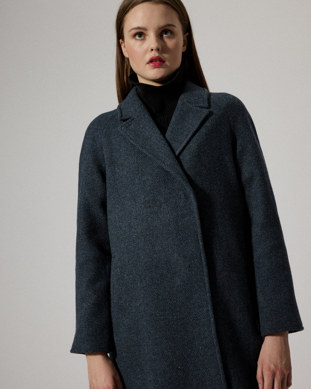 Deb is crafted in a warm high quality Shetland wool, made from a raw wool material with one hundred percent European origin and is woven in a Portugese fabric mill. This coat is cut at mid-calf with a classic notched collar and lapel at front, tailored with raglan sleeves and a relaxed straight silhouette manufactured in Kaunas, Lithuania. Concealed snap button closure at front and fully lined in a viscose blend quality.