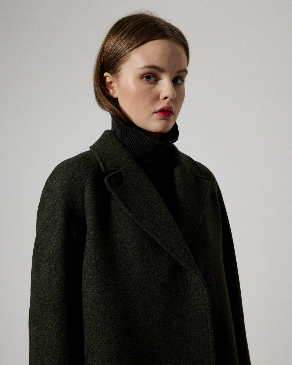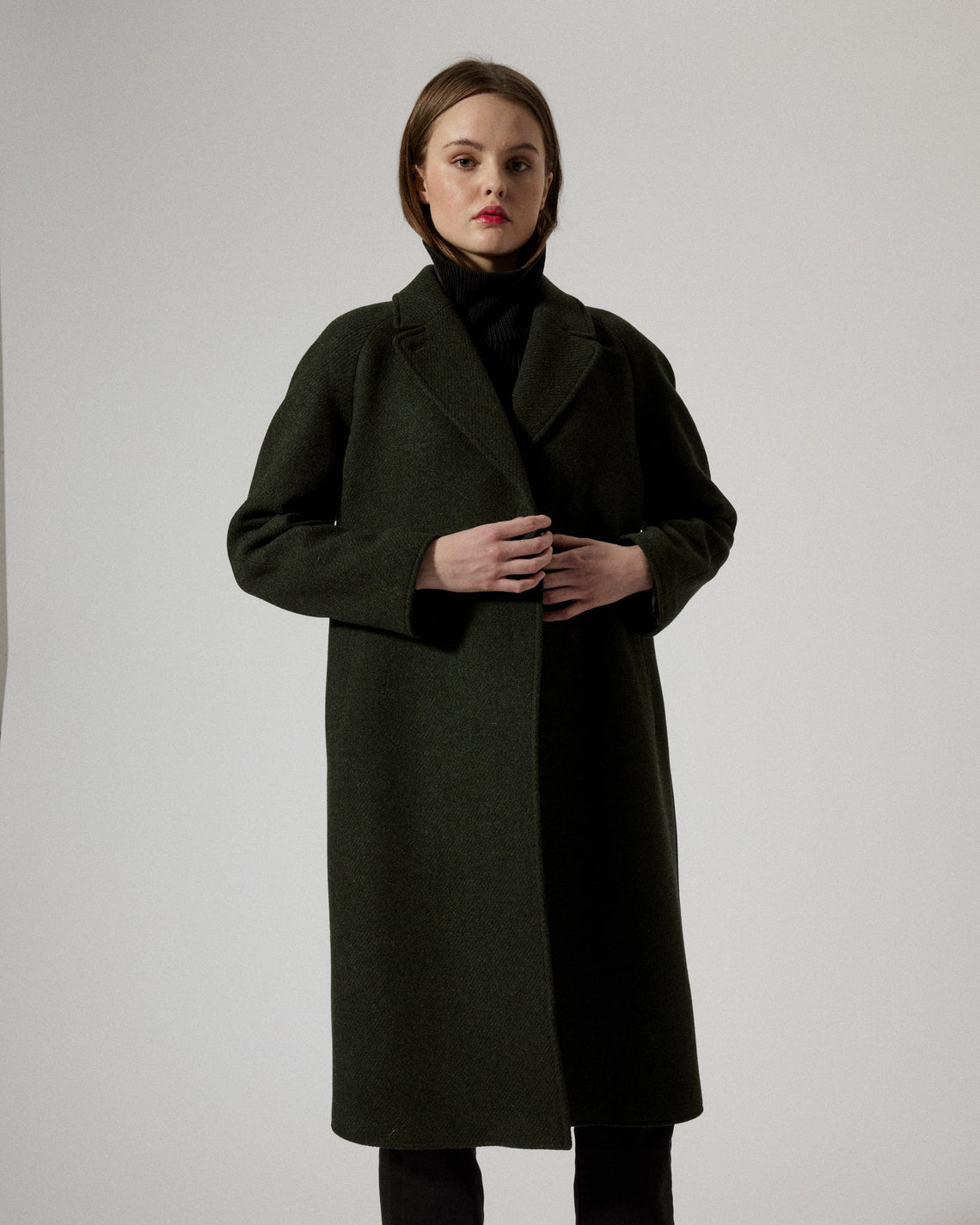 Deb is crafted in a warm high quality Shetland wool, made from a raw wool material with one hundred percent European origin and is woven in a Portugese fabric mill. This coat is cut at mid-calf with a classic notched collar and lapel at front, tailored with raglan sleeves and a relaxed straight silhouette manufactured in Kaunas, Lithuania. Concealed snap button closure at front and fully lined in a viscose blend quality.