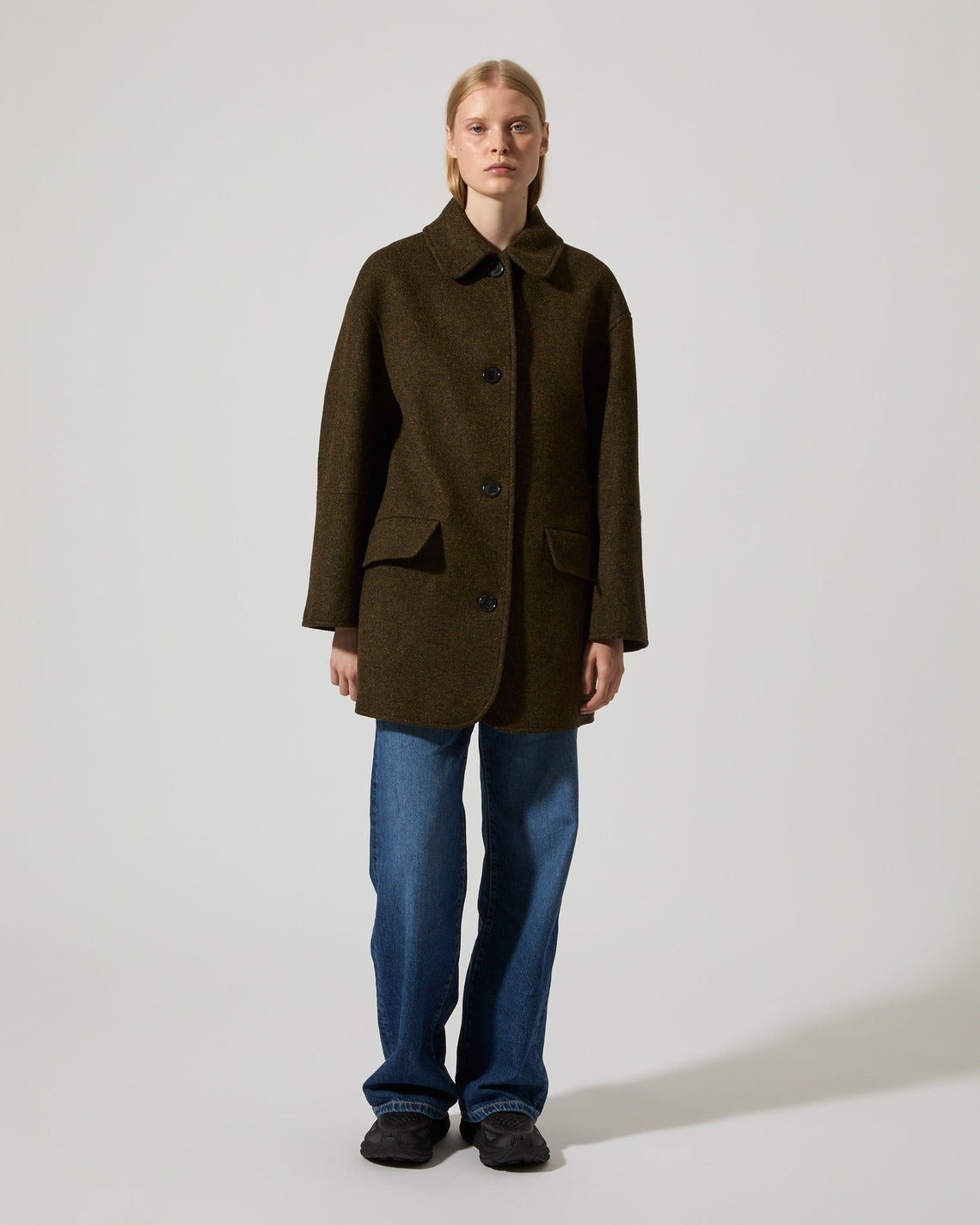 A coat cut at mid length featuring a slightly oversized silhouette with dropped shoulders and sewn buttons at front closure, produced in Kaunas, Lithuania. Distinct decorative seams and featured with front flap pockets and an inside pocket. Crafted in a warm high quality Shetland wool, made from raw wool material with one hundred percent European origin and is woven in a Portugese fabric mill.