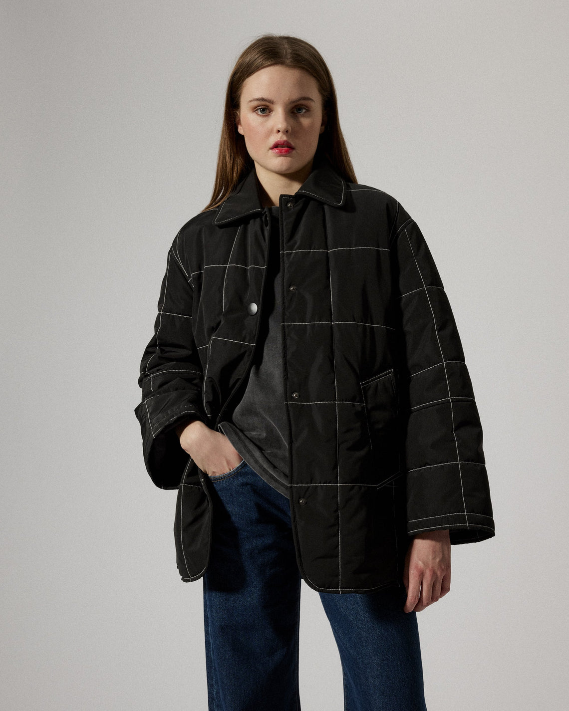 Edie is a loose fitted quilted jacket, cut in a shell fabric and padded with a padding both made out of recycled post-consumer PET-bottles certified under the Global Recycle Standard. The coat is featured with a regular collar, large snap buttons at front closure and a waterproof membrane, as well as a water repellant finish free from fluorochemicals. Equipped with welt side pockets and an inside pocket for added function.