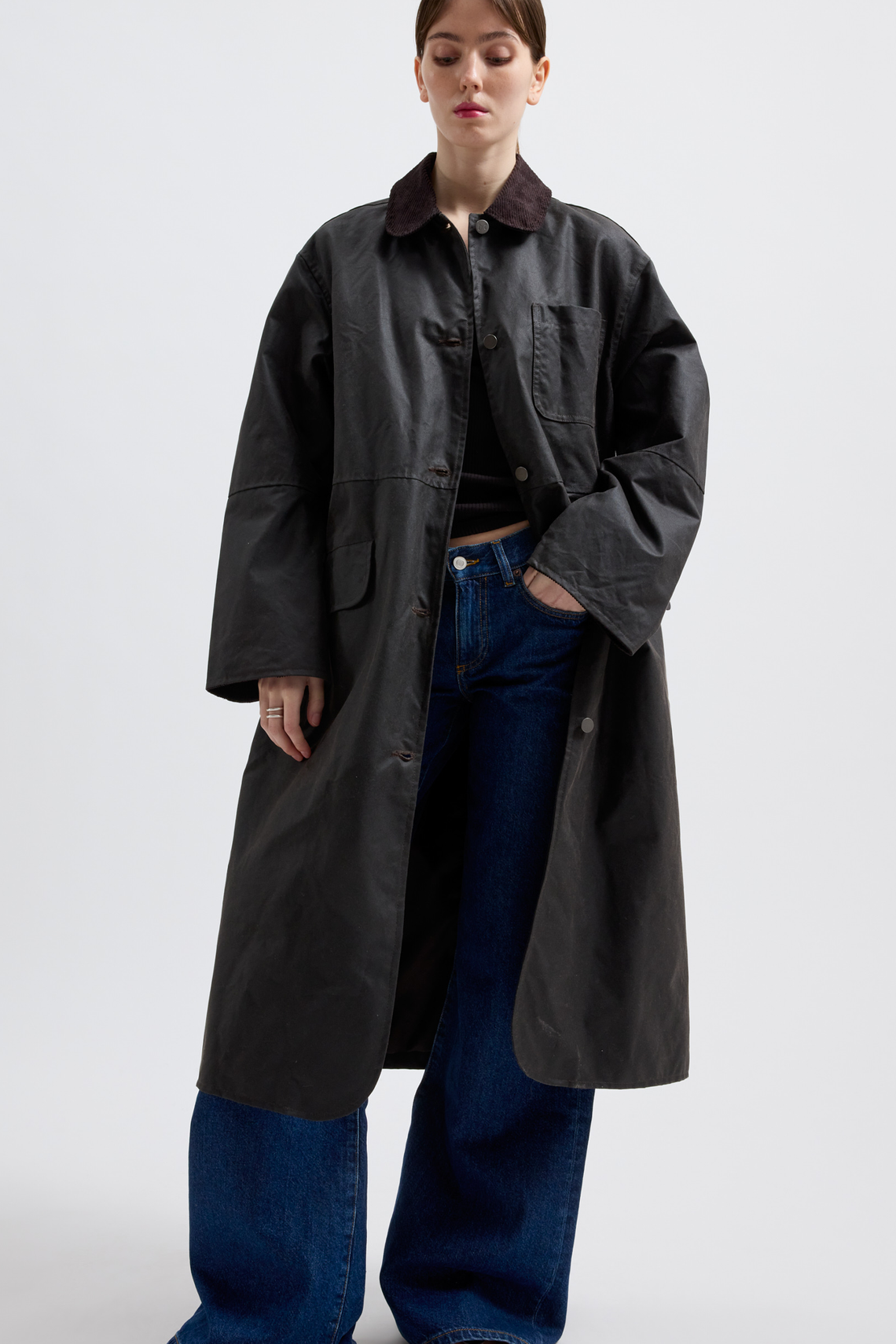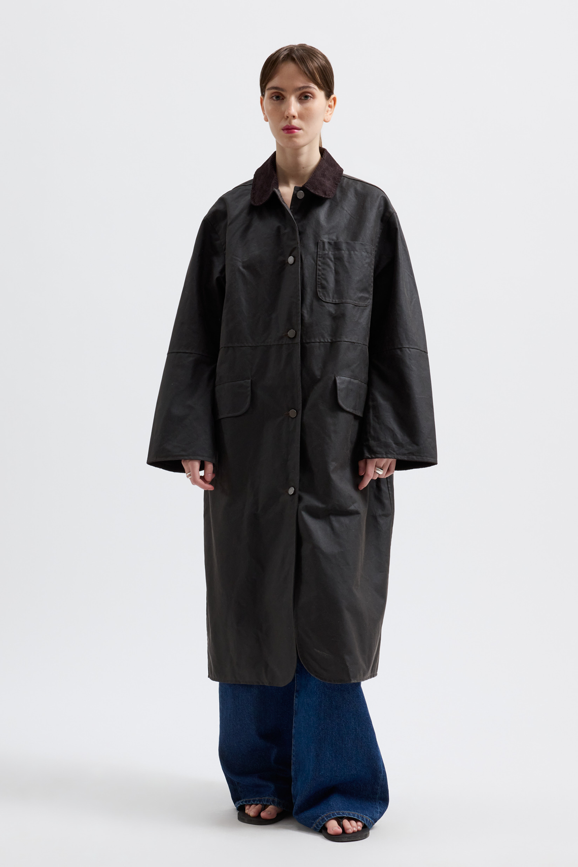 Cut below the knee, this coat is manufactured within Europe in the city of Birminghamn, UK, in a water resistant fabric. The water resistance is reached through the tradition of waxing the fabric. Corduroy at collar and inside cuff, featured with side flap pockets. The material in the buttons are made from recycled metal derived from Finnish surgical instrument production waste. For a long lasting garment, periodically rewax the shell fabric.