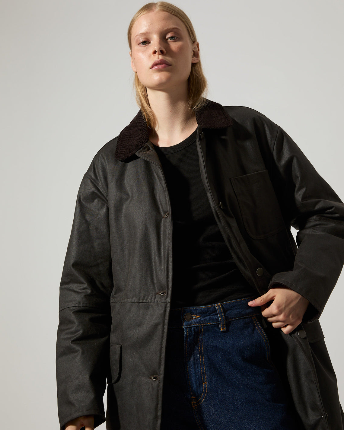 Joan Jett Padded is an oversized waxed organic cotton coat cut at mid-calf, manufactured in the city of Birminghamn, UK, featuring a water-resistant finish with a regular collar in corduroy. Featuring a jean button front closure, a chest patch pocket, and two front flap pockets. Designed for both practicality and timeless style, it's ideal for outdoor wear in transitional weather. For a long lasting garment, periodically rewax the shell fabric.