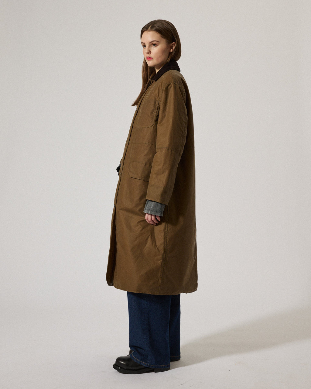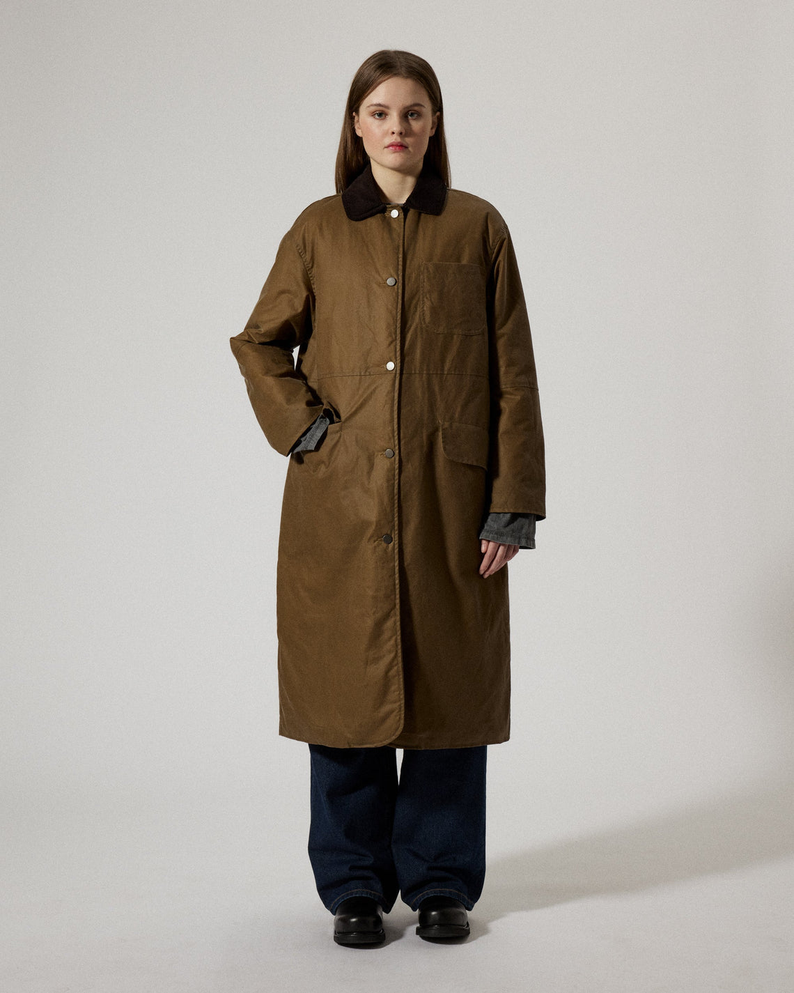 Joan Jett Padded is an oversized waxed organic cotton coat cut at mid-calf, manufactured in the city of Birminghamn, UK, featuring a water-resistant finish with a regular collar in corduroy. Featuring a jean button front closure, a chest patch pocket, and two front flap pockets. Designed for both practicality and timeless style, it's ideal for outdoor wear in transitional weather. For a long lasting garment, periodically rewax the shell fabric.