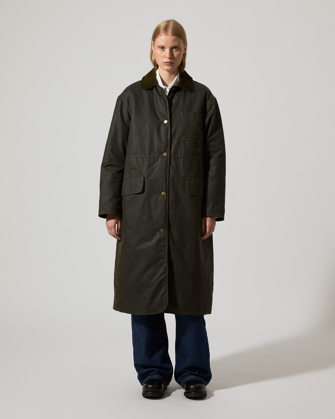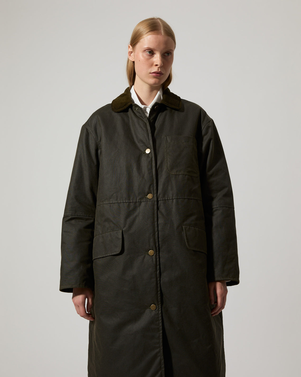 Joan Jett Padded is an oversized waxed organic cotton coat cut at mid-calf, manufactured in the city of Birminghamn, UK, featuring a water-resistant finish with a regular collar in corduroy. Featuring a jean button front closure, a chest patch pocket, and two front flap pockets. Designed for both practicality and timeless style, it's ideal for outdoor wear in transitional weather. For a long lasting garment, periodically rewax the shell fabric.