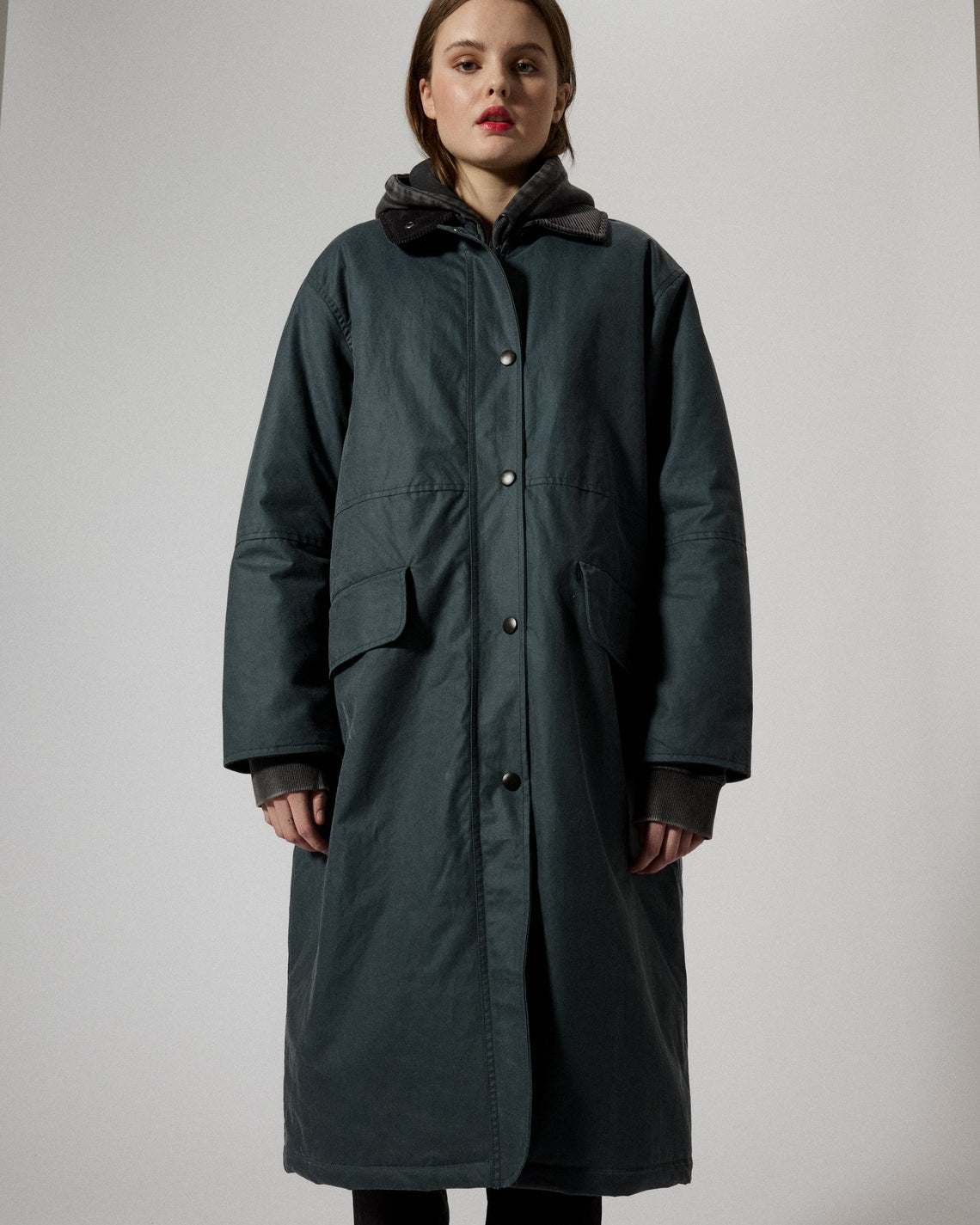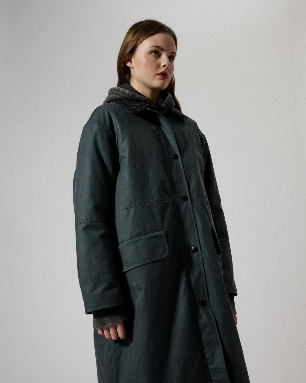 An oversized waxed organic cotton coat cut at mid-calf, manufactured in the city of Birminghamn, UK, featuring a water-resistant finish with a regular collar in corduroy. Featuring a two way zipper concealed by a placket front closure, and two front flap pockets. Designed for both practicality and timeless style, it's ideal for outdoor wear in transitional weather. For a long lasting garment, periodically rewax the shell fabric.
