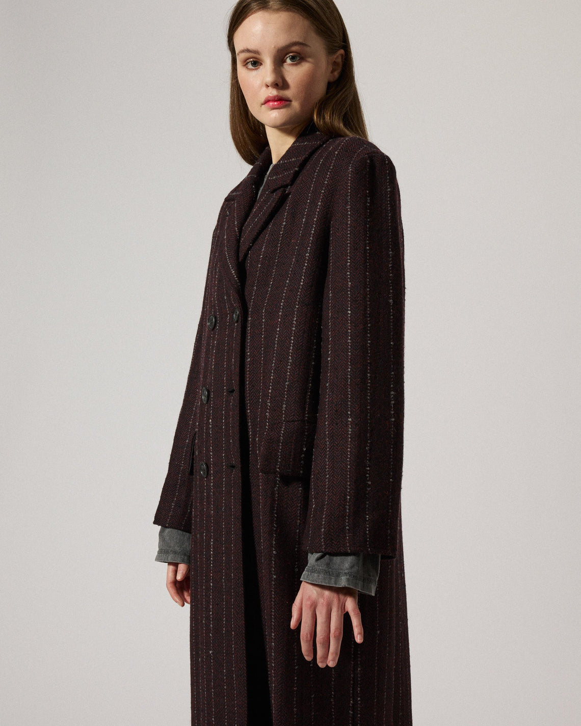 Olivia is an oversize wool coat cut to fall at the ankle. The coat features a long silhouette with wider defined shoulders and detailed with double breasted buttoning at front and flap pockets at the sides. Made from a soft recycled wool blend with a slight brushed finish which creates a soft feel to the touch, certified under the Global Recycle Standard.