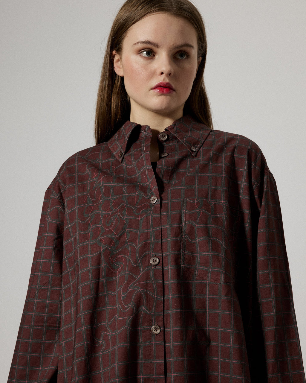 An oversized shirt crafted from a textured and soft washed cotton quality, cut in a contemporary loose silhouette with a straight slightly wider sleeve. Featured with sewn mother of pearl buttons at front and cuff, and with an added topstitched pleat below back yoke for added detailing.