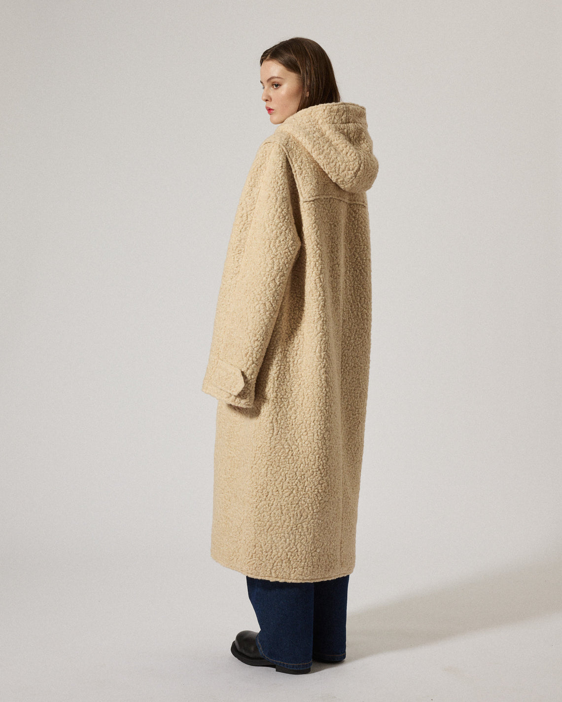 Rudie is an oversized hooded coat inspired by the classic duffle crafted in a soft, textured pile fleece in a warm oat color made from recycled fibers, offering cozy insulation and a relaxed silhouette. Featuring a concealed snap button front closure, spacious flap pockets, and a clean, tailored cut that drapes elegantly. The generous hood and the full ankle length adds functional comfort.