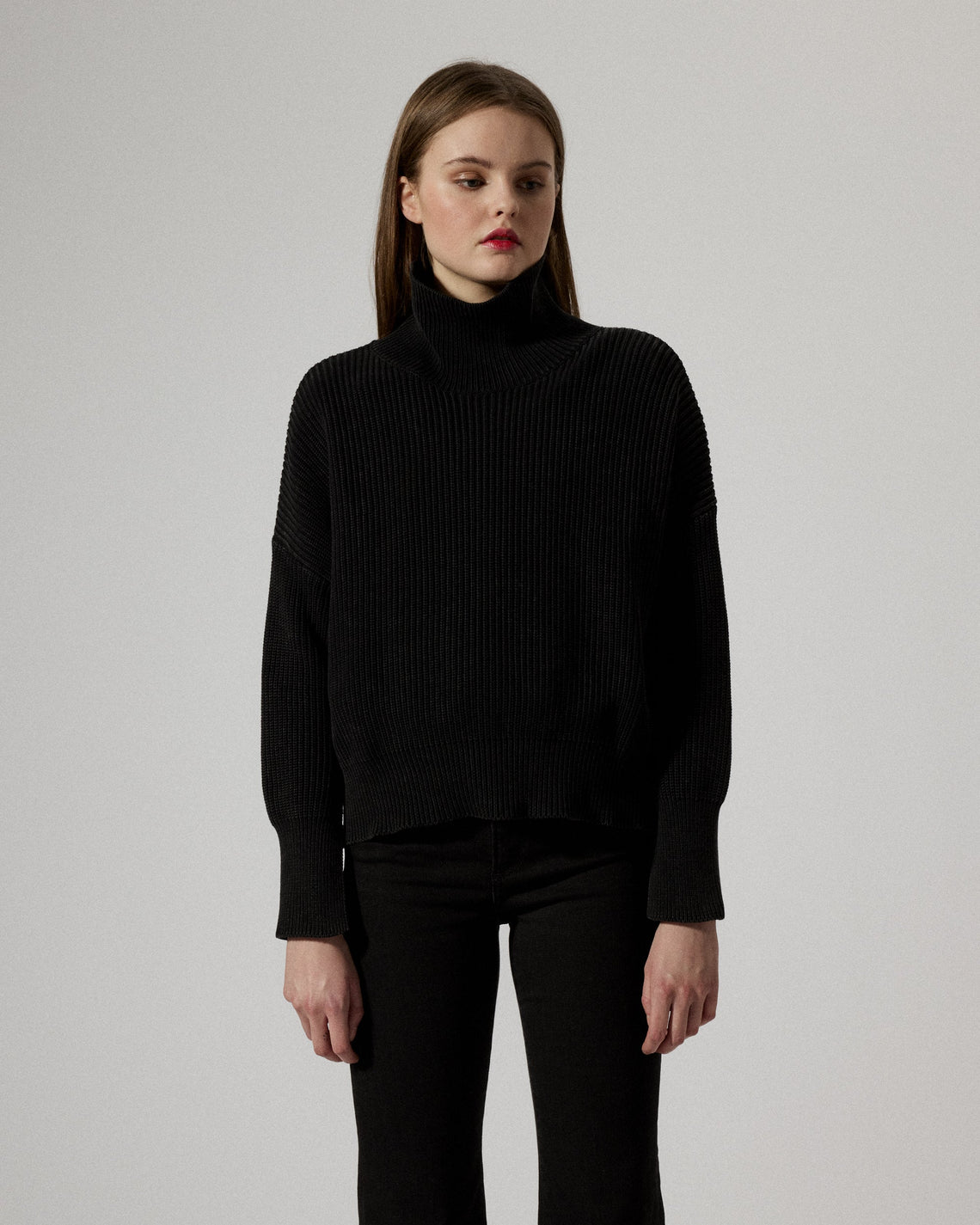 Sage is a funnel neck sweater in a soft high quality organic cotton, knitted in a 5 gauge half cardigan stitch and treated with a stonewash for a vintage look. High standing neck, bottom hem and sleeve endings in a rib knit. Discreet slits at cuff and a small monogram embroidery at the bottom hem.