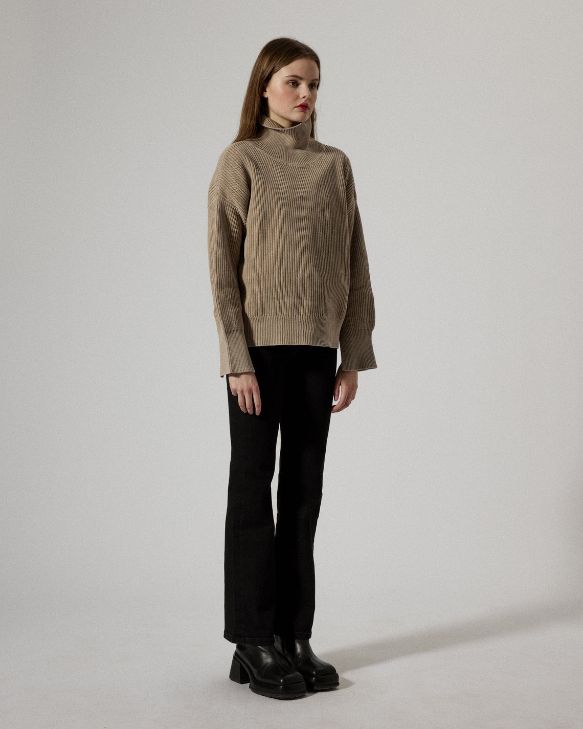 Sage is a funnel neck sweater in a soft high quality organic cotton, knitted in a 5 gauge half cardigan stitch and treated with a stonewash for a vintage look. High standing neck, bottom hem and sleeve endings in a rib knit. Discreet slits at cuff and a small monogram embroidery at the bottom hem.