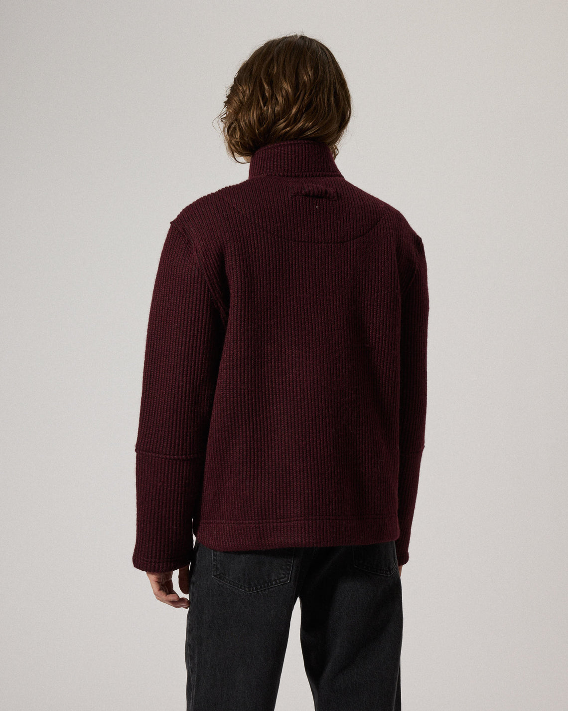 A zip-up cardigan crafted in a textured, warm heavy rib knitted fabric made from recycled fibers certified under the Global Recycle Standard. Featuring a high funnel neck, full front two way zip, and relaxed fit with long sleeves. Side pockets add practicality, while the clean lines and deep hue ensure effortless layering.