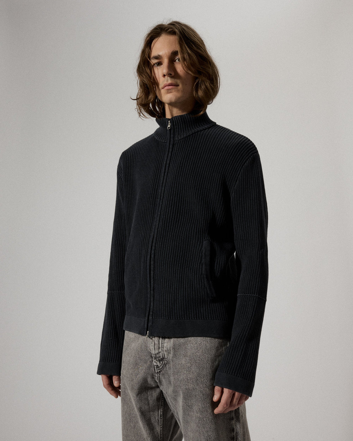 Seven is a cardigan in a soft high quality organic cotton, knitted in a 5 gauge half cardigan stitch treated with a stonewash for a vintage look. Featuring a two-way zip front closure, a high collar, ribbed details and side pockets. Decorative seams across the elbows and a small monogram embroidery at the bottom hem.