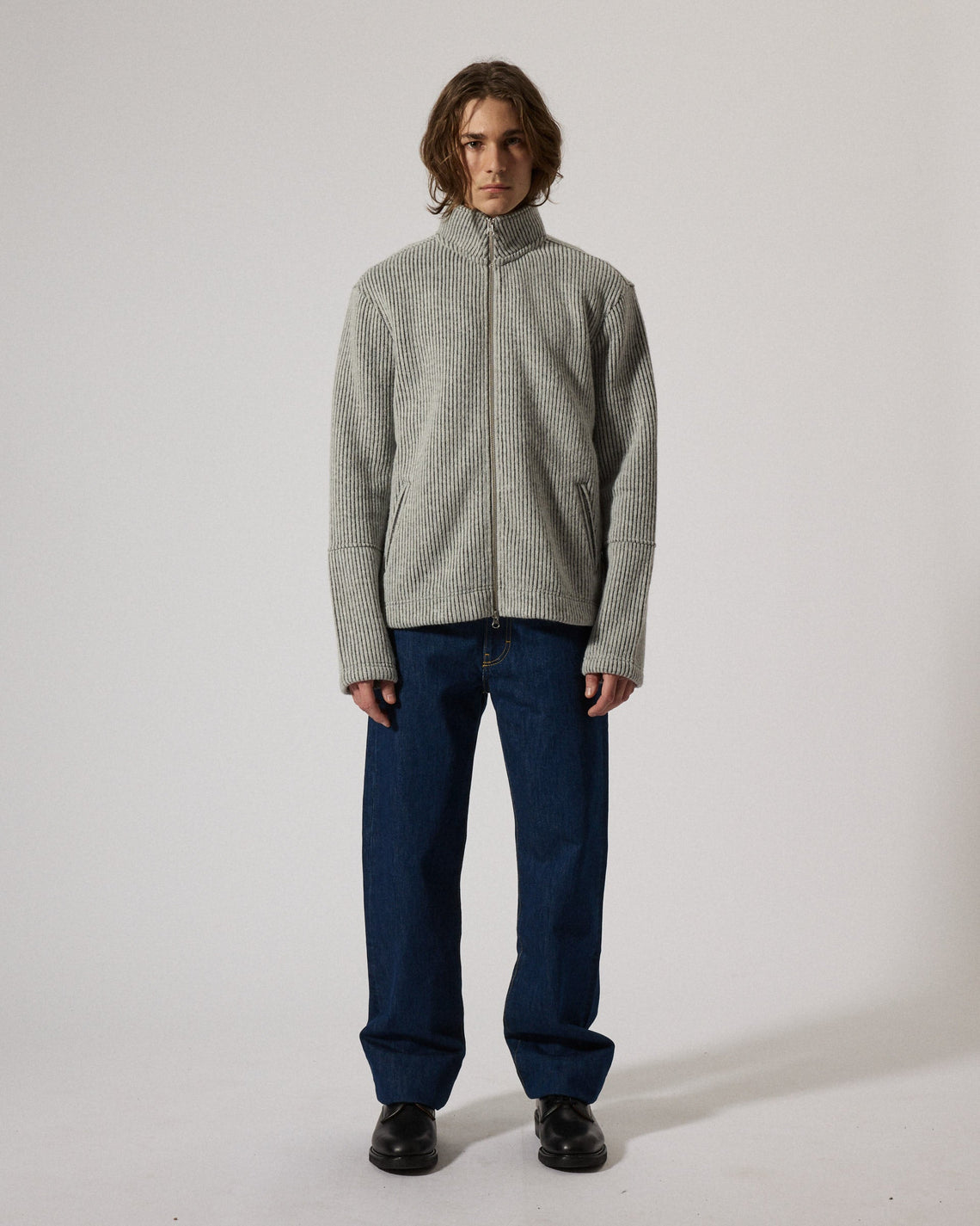 A zip-up cardigan crafted in a textured, warm heavy rib knitted fabric made from recycled fibers certified under the Global Recycle Standard. Featuring a high funnel neck, full front two way zip, and relaxed fit with long sleeves. Side pockets add practicality, while the clean lines and deep hue ensure effortless layering.