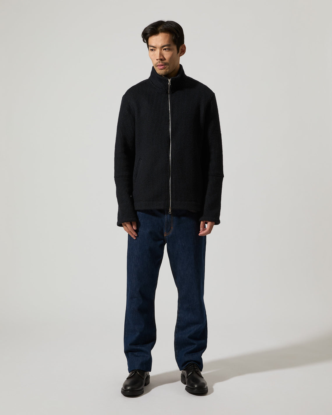 A zip-up cardigan crafted in a textured, warm heavy rib knitted fabric made from recycled fibers certified under the Global Recycle Standard. Featuring a high funnel neck, full front two way zip, and relaxed fit with long sleeves. Side pockets add practicality, while the clean lines and deep hue ensure effortless layering.