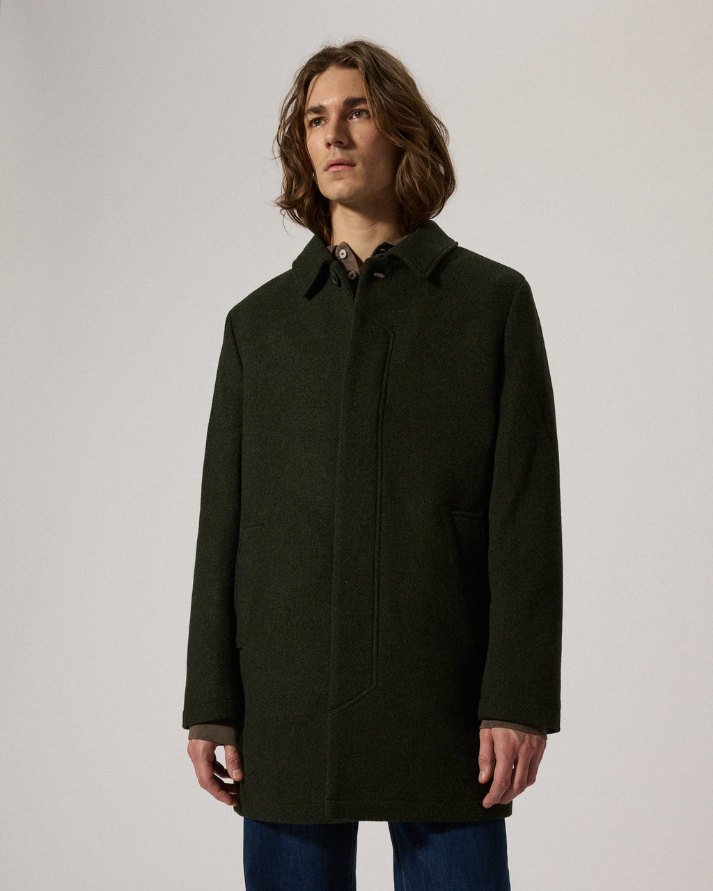Crafted in a Shetland quality made from raw wool material which derives one hundred percent from European origin and is woven in a Portugese fabric mill, certified by Oeko-tex. T-Coat Wool is a car coat cut at mid-length with a classic silhouette and a regular collar. Featured with simple detailing which creates a clean and minimalistic look. Concealed buttons at front closure, except top button.